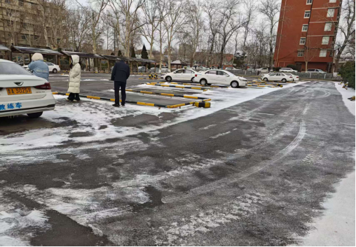 2026年1月19日,济南突降的雨夹雪使驾校训练场地形成坚硬雪层,正常教学特别是临考学员的考前集训面临中断风险。
